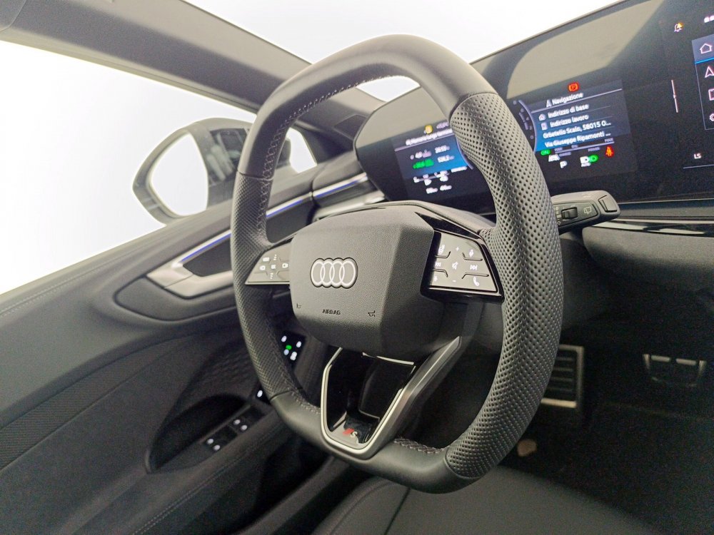 Applicazione volante in look cromato- emblema S- impugnature del volante in pelle traforata e cucitura a contrasto